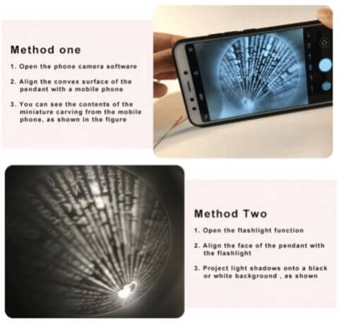 • Presenta el mensaje «Te amo» en 100 idiomas, grabado con el método de nano micro tallado. Puede verlo a través de cada lente estándar de cámara / teléfono inteligente. Proyecta el corazón central sobre un fondo negro con la linterna de tu cámara para mostrar tu amor.