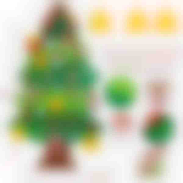 Hechos del mismo fieltro grueso y de alta calidad. Se sujetan con velcro cosido (a diferencia de los más baratos pegados). Ejemplos incluyen campanas, regalos, muñeco de nieve, caramelos y copos de nieve. El árbol tiene una estrella para la parte superior y un tronco para la base. El velcro está cosido en el árbol para sujetar ambas piezas de forma segura.