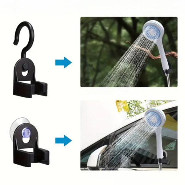 La ventosa fija el cabezal a cualquier superficie plana; el gancho lo eleva cuando lo necesitas por encima de la cabeza. Con 600 g y 1,5 m de manguera, cabe en cualquier bolsa, se carga de camino y funciona tanto si estás quitando el barro de las botas como bañando al perro después de un largo paseo.