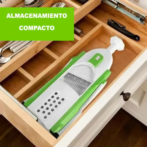 El diseño plegable ahorra espacio, ideal para cocinas de cualquier tamaño. Además, te permite preparar frutas y verduras en diferentes formas de manera rápida y segura.