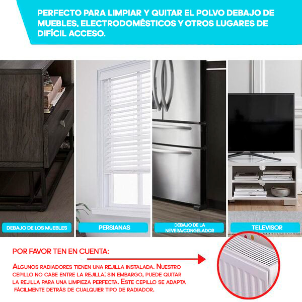 No es necesario desmontar las rejillas de tu radiador. DUSTOFF está hecho a medida para la limpieza de radiadores. Su carga electrostática atrae el polvo y la suciedad, por lo que es ideal para radiadores tipo panel, columna, lobulados, tipo escalera y toalleros.